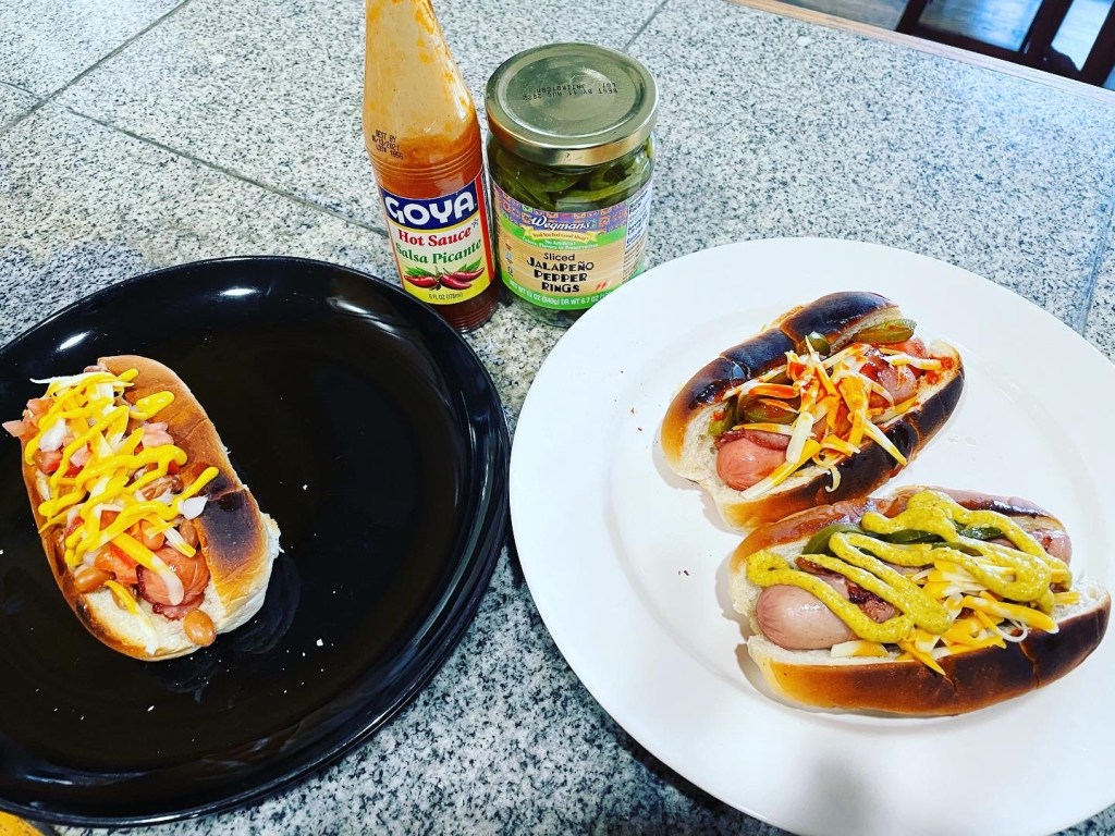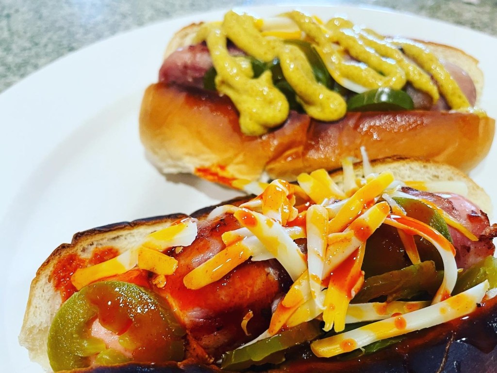 The Sonoran Hot Dog! I shied away from this one initially because I didn’t like the mayonnaise on top, but Lisa was like “no way, there are a number of ways you can make them!” Wow! She went the most traditional route with hers, red hot with onions, tomatoes, mayonnaise, beans, but then added yellow mustard and Colby cheese. I had a red and a white, lodged jalapeños on both, same Colby cheese, but went with Goya Salsa Picante sauce on the red, and Spicy Brown on the white. OH, and I Forgot to mention: they’re both wrapped in BACON! I guess I saved the best for last. Good dogs though, nice job, Leese!