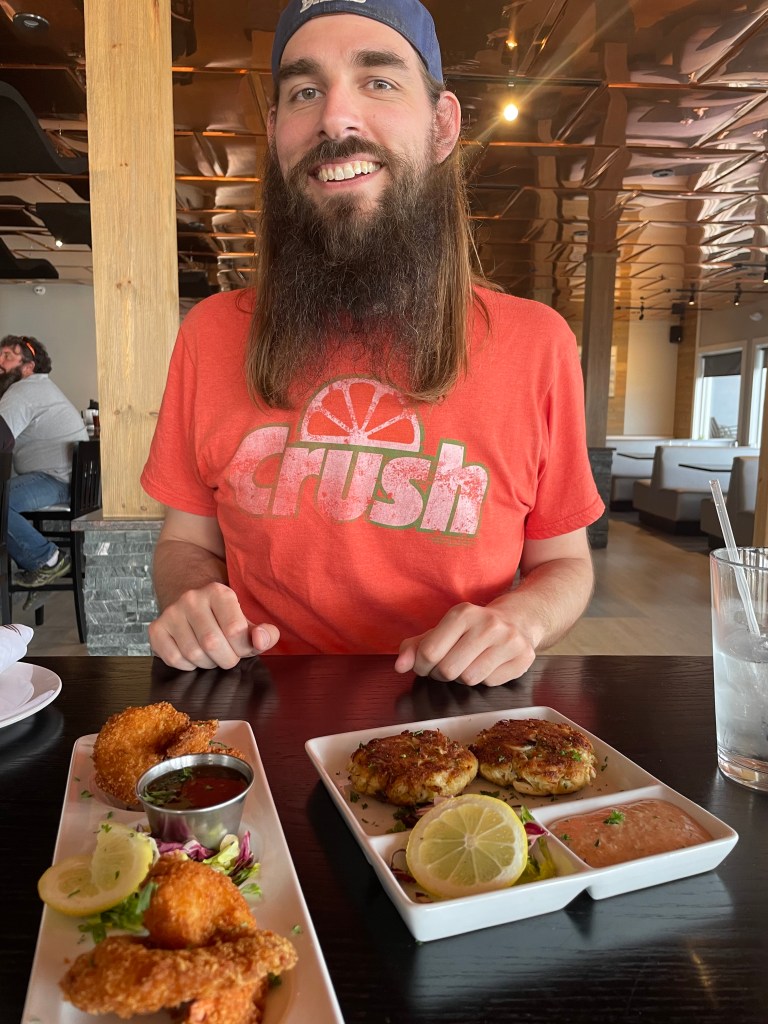 After a day of waterfall hunting in Upstate NY, we stopped by Lures in Kendall by the edge of Lake Ontario to Relax and Unwind. Knowing that today was Martinsville, and Virginia is known for their blue crab (and peanuts, stay tuned!), I opted for the crab cakes…and was treated to the best crab cakes I’d ever eaten in a restaurant! Lisa made some last year that were pretty darn good, and way too good for how little they cost. In any event, great meal with some coconut shrimp (pictured), and a grilled chicken sandwich, clam chowder, and a grilled prime rib sandwich, too. And then…dessert!