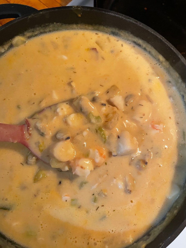 Lisa has whipped up a Seafood Chowder here, inspired by Palmer’s Seafood here in Rochester. Don’t get me wrong, she made this from scratch in the kitchen. Scallops, shrimp, clams, and cod have all joined the party, and it smells wunderbar in there. This thing is so chunky we’re bordering on stew territory here. Looking forward to a nosh once the race starts, had a taste already and it is well on its way. Good stuff, Leese!