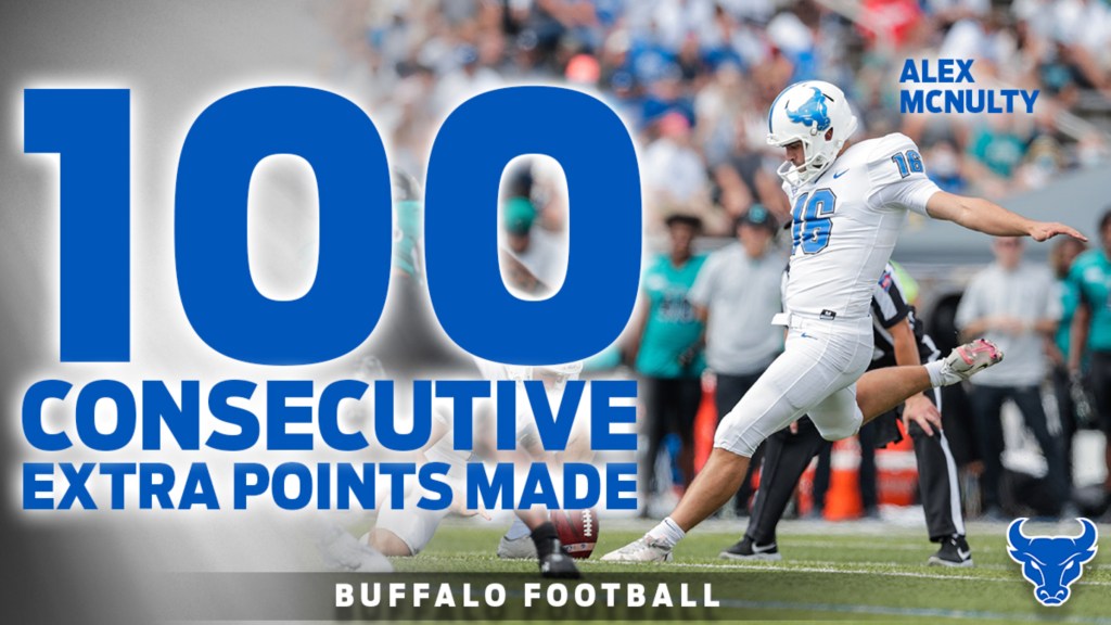 There are fourteen Section Fivers on the roster of the University of Buffalo football team. Including kicker Alex McNulty out of McQuaid. Originally a walk on for the Bulls, McNulty won the starting job as a sophomore and led the team in scoring this year. McNulty kicked a 55-yard field goal to send Buffalo’s game against Northern Illinois to overtime. It was a school record kick.