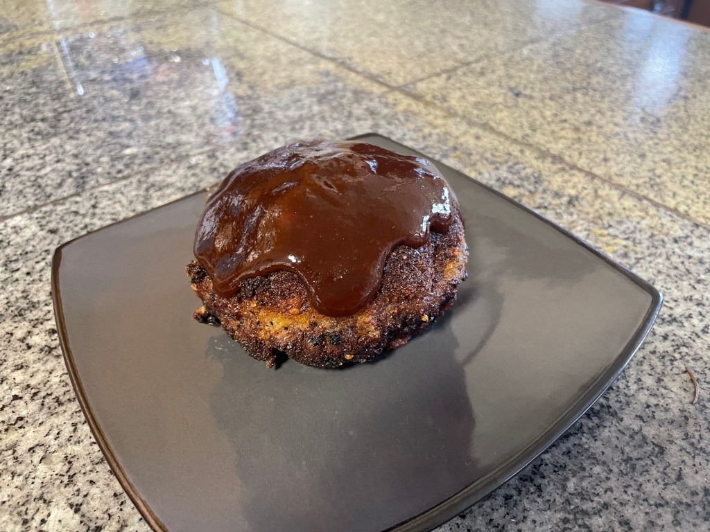 There it is! A massive meatball stuffed with pulled pork, pepperjack and mozzarella, and BBQ sauce stuffed inside. They’re about the size of softballs, breaded in panko, and deep fried before being baked. A lot of steps there, but how will the payoff be? We broke into one early before the race, and many, it is a feast for the tastebuds. I had strong notes of the steak seasoning and pulled pork while Lisa felt the kick of the pepperjack. Nice job, Leese! I hope we’re not checking into Heartburn Hotel later, but what appeal to the eyes: The Big One!