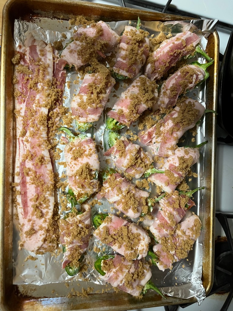 Darlington inspired Pimento cheese stuffed Jalapeños with candied bacon. Hmm.. First off, I gotta say, looks like these were made by someone who doesn’t know their way around a kitchen!! Beyond that, they taste alright, I guess. Something seems…off though. Lisa thinks its because of the stems. I don’t. The pan is like a soupy cheese bog with portions of the plate ensconced in candied brown sugar lily pads. I made some bonus candied bacon and that came out better alone than the bacon wrapping paper. I dunno, mannn. They taste decent, but something just seems wrong with them. I’ve eaten enough (testing them out) that it is too late for me to not get sick if I’m going to get sick, haha. I miss my fiancé (down south for the weekend). And she’s really good at this stuff. Subpar job, me! Boo this man!! BOOOOOOOO!!