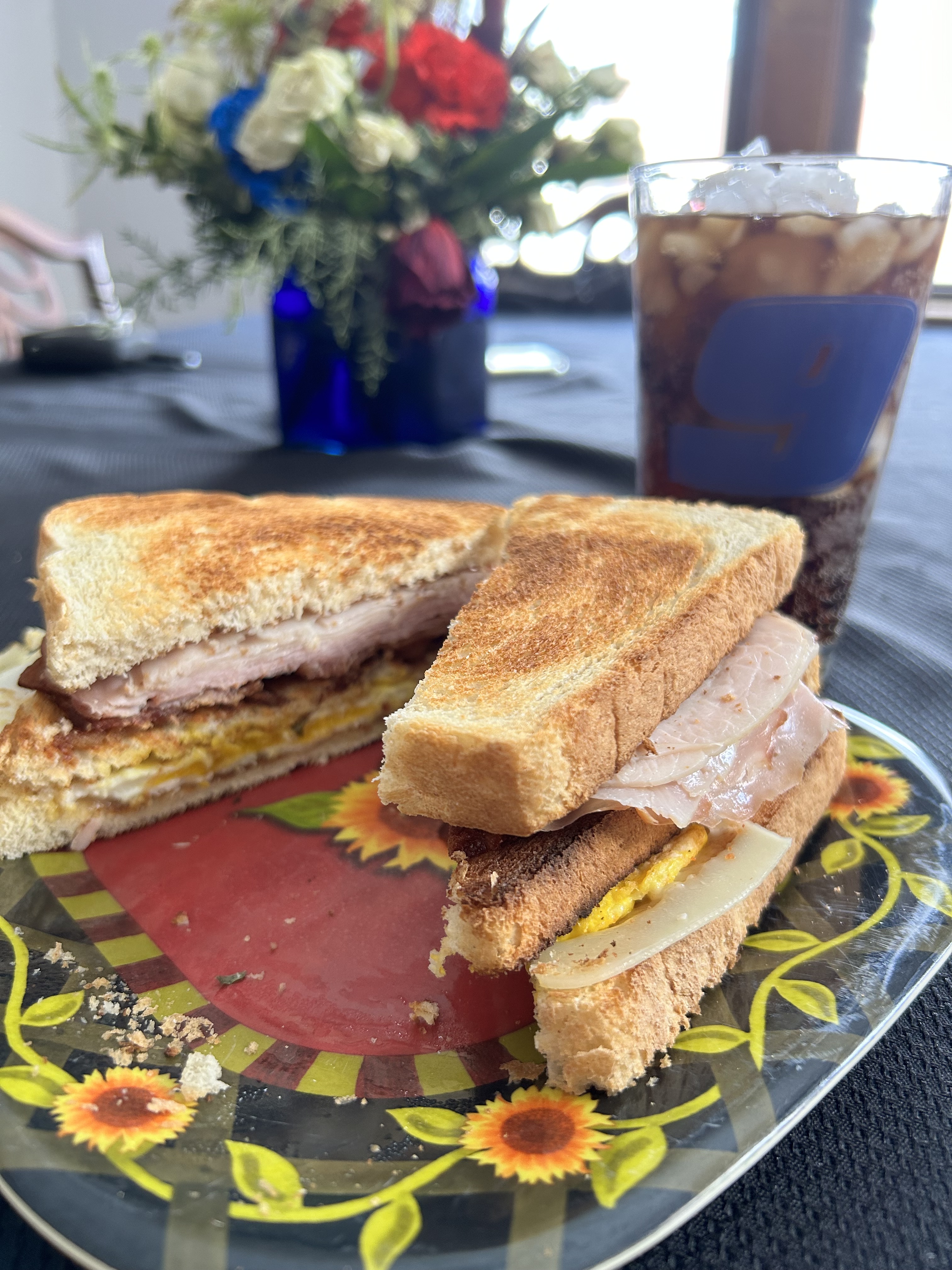 The Auto Club Sandwich! That’s what we call it, it is actually the Bel-Air Club (and modified for tastes). I really like it a lot, Lisa does a great job throwing it together. I’m a dude who likes multiple meats on a sandwich, and this one gives us ham, turkey, bacon, and eggs, if you want to count a fourth protein. Enough typing, more eating! (And we’ll have some Key Lime Pie after, too. Back by popular demand, Lisa made another delicious pie after last week! Awesome!)